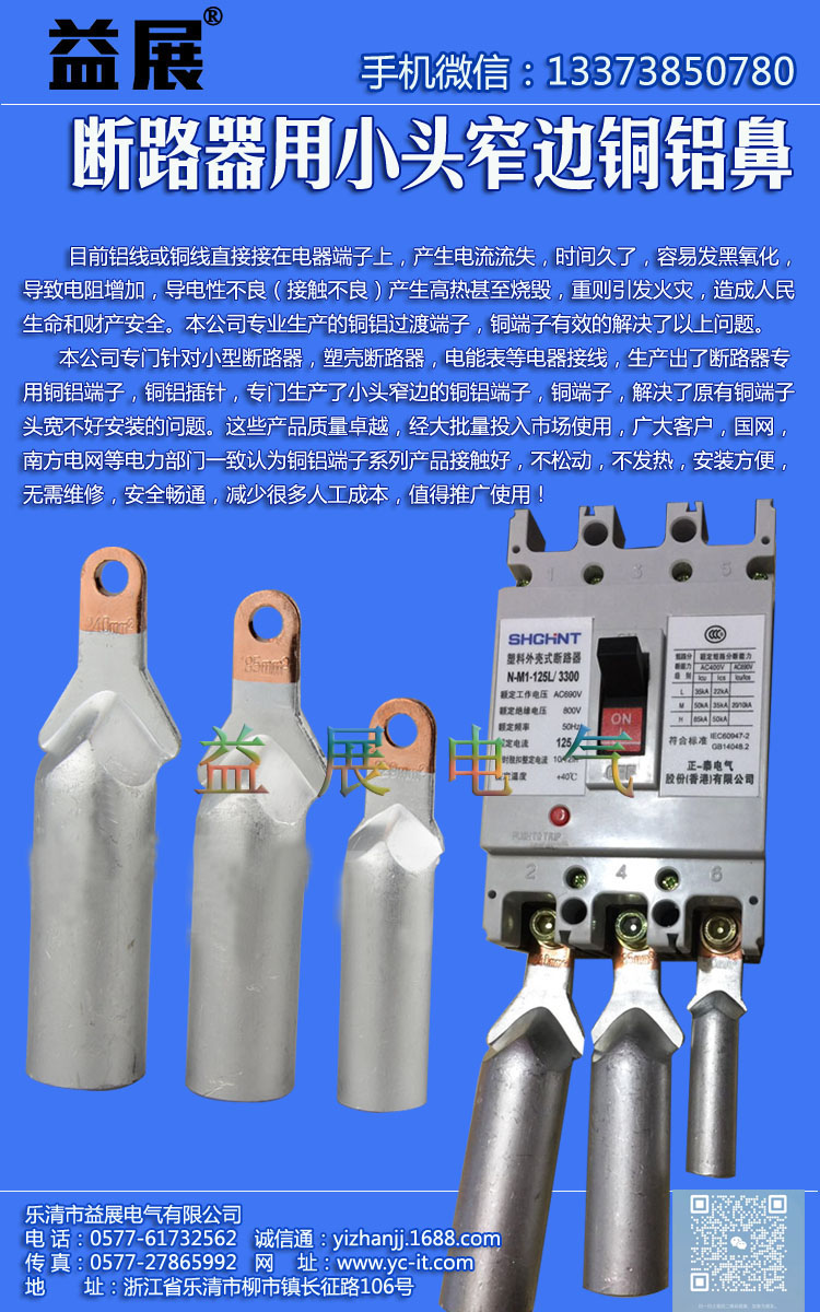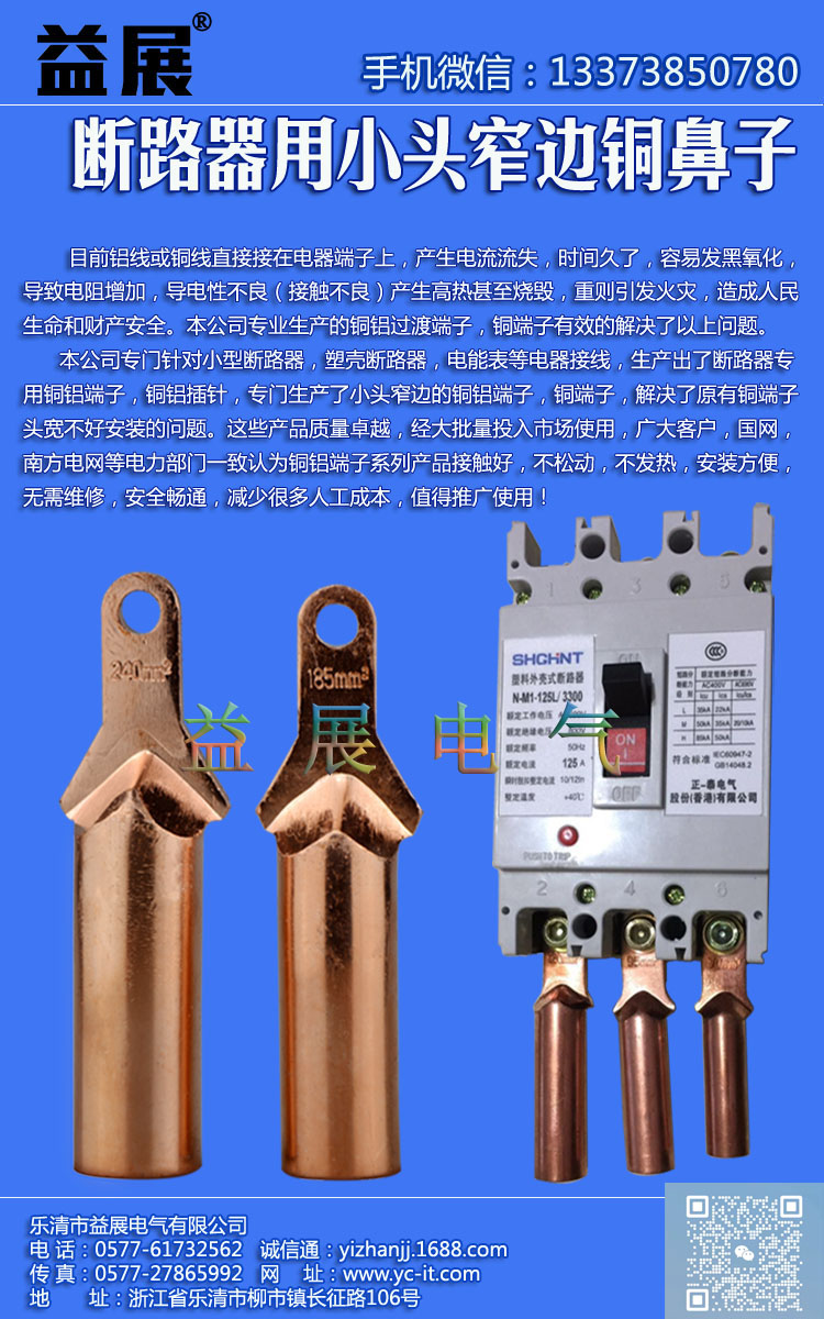 益展電氣專業(yè)生產(chǎn)各種銅鼻子,雙孔銅鼻子,銅鋁過渡線鼻子,SC窺口線鼻子,雙孔銅鋁鼻子,冷熱縮電纜附件,穿刺線夾,堵油銅鼻子,冷壓端子,C45插針,OT開口鼻子,管型冷壓端頭,銅鋁線夾,接線端子,接插件,壓線帽,等各系列配線器材。廠家直銷,價格優(yōu),質(zhì)量高。歡迎與各界人士合作。